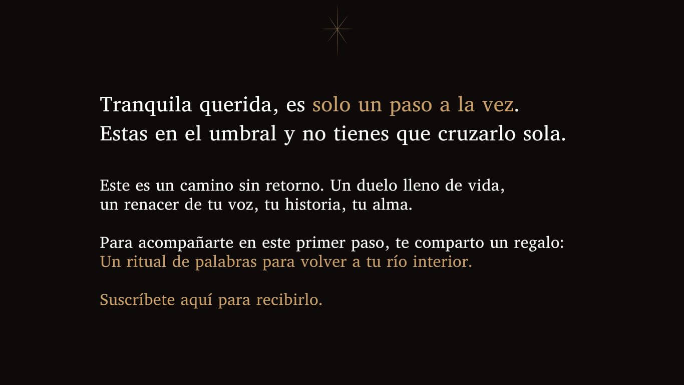 CÓMPRALO AQUÍ ACCEDE AL RITUAL SÉ LA PRIMERA EN SABERLO quiero escribirte…si tú quieres leerme. Recibe mis cartas miraculosas en tu email * indicates required Email *Cómo te gusta que te llamen (sin apellido) Es ella la que te llama...Confirma que puede llegar a tu:EmailRespetar tus datos, tu atención y tu energía como si fuera la mía (mi política para cuidarte está en la web). Puedes desistir en cualquier momento siguiendo el enlace al final de todos mis mensajes. Inscribiéndote manifiestas estar de acuerdo con estos términos.Usamos Mailchimp como plataforma de marketing. Al hacer click para suscribirte, aceptas que tu información sea transferida a Mailchimp para su procesamiento. Conoce mas sobre las practicas de privacidad de Mailchimp. /* real people should not fill this in and expect good things - do not remove this or risk form bot signups */